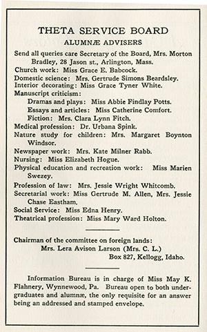 In 1913, Theta created the Service Bureau, which organized alumnae to study and assist in efforts not related to fundraising. Among the committees created, a group of alumnae assisted collegians selecting “college courses that will help them later in their chosen vocations” and advising “as to demands and returns of different professions.” The vocational committee worked with the Association of Collegiate Alumnae (forerunner of the AAUW [American Association of University Women]) to help Thetas find positions but Theta alumnae also advised and mentored.